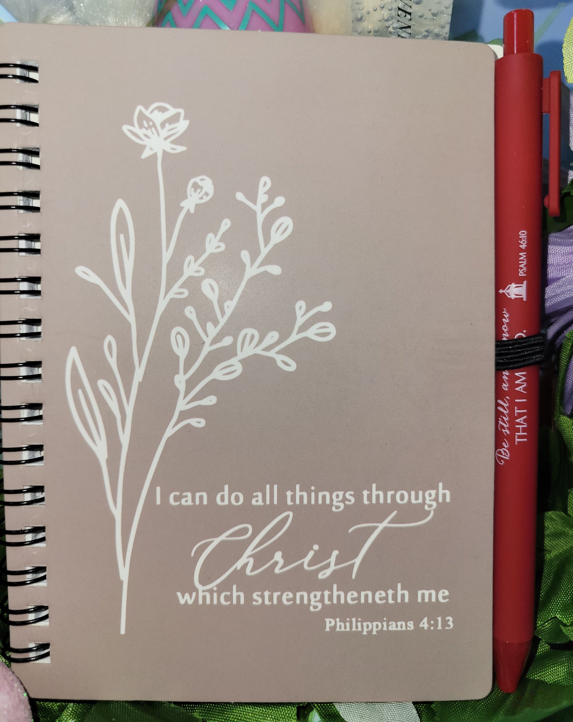 - Small notebook"I can do all things through Christ which strengthens me" and pen"Be still and know THAT I'M GOD"